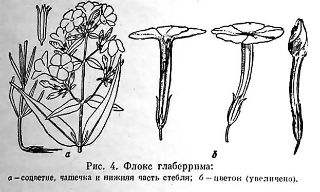 Флокс глаберрима (Ph. glaberrima L), гладкий (рис. 4). Растения этого вида встречаются в прериях, по обочинам дорог и в разреженных лесах. Распространен флокс глаберрима от Виргинии до Флориды и на запад до Висконсина, Иллинойса, Арканзаса, Луизианы, Техаса. В Виргинии он поднимается в Аппалачские горы на высоту до 600 м над уровнем моря.