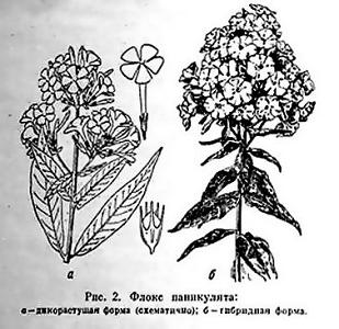 Флокс паникулята (Ph. paniculate L.), метельчатый (рис. 2) — родоначальник большинства садовых культурных сортов многолетних флоксов летне-осеннего цветения. В диком виде произрастает на полянах влажных лесов и кустарников, в низинах и других сырых местах, расположенных вдоль речных долин. Распространен в штатах Нью-Йорк, Виргиния, Пенсильвания до Флориды и на запааде до Луизианы, Оклахомы, Канзаса и Небраски.