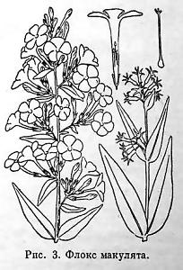 Флокс макулята (Ph. maculata L.), пятнистый, на родине называется луговым флоксом (рис. 3). Его синонимы: Ph. piramidalis Smith; Ph. reflexa и Ph. penduliflora Sweet. Встречается во влажных кустарниковых зарослях, в сырых разреженных лесах, по лугам, берегам рек.