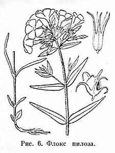 Флокс пилоза (Ph. pilosa L.), волосистый, называемый на родине флоксом прерий (рис. 6). Похож на флокс глаберрима, но часто более или менее опушенный. Распространен примерно там же, где и флокс глаберрима, но заходит дальше на север.