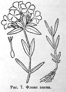 Флокс амена (Ph. amoena Sims), приятный. Синонимы — Ph. walterii Chapm.; Ph. involucrata Wood (рис. 7). В диком виде произрастает в сухих местах от Виргинии до Кентукки, Теннеси и Флориды.