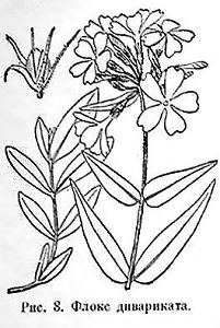 Флокс дивариката (Ph. divaricata L.), флокс раздвинутый, на родине называется дикой голубой гвоздикой (рис. 8). В Европе его иногда называют флоксом канадским (Ph. canadensis Sweet.). Произрастает во влажных лесах и зарослях на довольно разнообразных почвах: иногда на скудных песчаных, на каменистых склонах, чаще же на питательных почвах в лесу, где весной образует сплошные ковры голубых цветов.