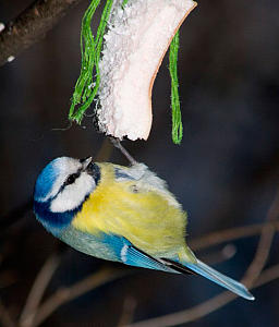 Синицы — эквилибристы, они могут висеть на любой веревочке, раскачиваться, есть вниз головой. Им так комфортно, или голова все-таки и у них кружится, и лучше сделать устойчивую кормушку?