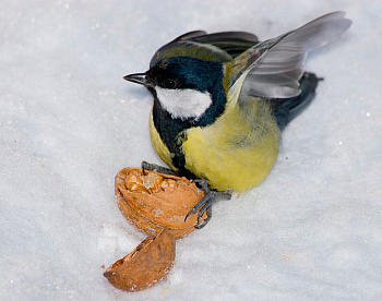 Угощая синиц грецким орехом, надколите скорлупу. Птичке самой не справиться
