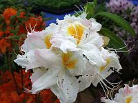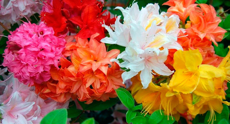 Цветки азалий отличаются необыкновенно богатой гаммой окрасок: желтые, оранжевые, красные, розовые и белые, с эффектными, контрастными рисунками на верхних лепестках, с волнистыми, гофрированными краями, широко открытые и звездчатые, простые и махровые, достигая от 4-5 до 7-9 см в диаметре. Они собраны в рыхлые или плотные соцветия и обычно очень приятно пахнут, напоминая запах жимолости каприфоль или гиацинтов.