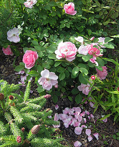 Розам особое уважение. Их обрезаем над первой сильной почкой, смотрящей не внутрь куста, а наружу, заодно наполовину укорачиваем жирующие побеги, чтобы сохранить форму куста. Срезы замазываем средством «Раннет». И непременно собираем опавшие лепестки.
