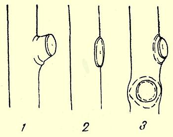 Вырезка веток на кольцо: 1 - неправильно - оставлен пенёк; 2 - неправильно - срез слишком глубок; 3 - правильно - срез сделан по верхней части кольцевого наплыва