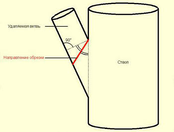 Обрезка ветки, отходящей от ствола под острым углом (наплыв незаметен)