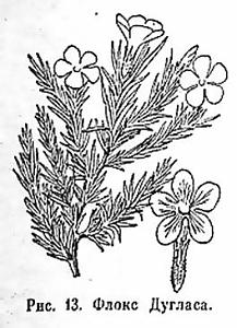 Флокс Дугласа (Ph. Douglasii Hook.) (рис. 13). Произрастает на восточных и западных склонах Скалистых гор, на сухих почвах от Юкона и Британской Колумбии (Канада) до Орегона, Юты и Калифорнии. Цветет в мае — июле. Похож па предыдущий вид, сплошь покрыт мелкими, узкими, шиловидными, опушенными или почти голыми листьями. Отличием служит более высокий рост флокса Дугласа (10-20 см). Растения образуют плотные дернинки; цветки мелкие, около 1,25 см в диаметре, на коротких цветоножках, пурпурные, лиловые или белые. Лепестки венчика яйцевидные, цельнокрайние. Красивыми разновидностями флокса Дугласа считаются флокс расширяющийся (var. diffusa Gray) и флокс длиннолистный (var. longifolia Gray). Первый растет в сырых местах в западной части Сьерры-Невады и Каскадных гор от Калифорнии до Британской Колумбии; второй — в более сухих местах от западной части Небраски до Орегона и в cевepo-восточной части Калифорнии.