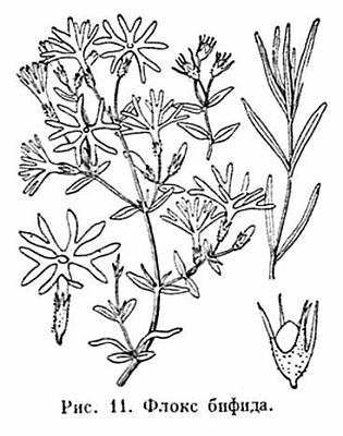 Флокс бифида (Ph. bifida Bock.), расщепленный (рис. 11). Распространен от Техаса до Айовы и Юго-Западного Мичигана. Растет в степях и прериях, на холмах, на каменистых или песчаных сухих почвах. Вечнозеленое растение с глубоко рассеченными на 2-3 доли лепестками цветков, фиолетово-пурпурного, сине-фиолетового или белого колера, слегка крапчатыми в зеве. Растение низкое, высотой 10-20 см, стебель твердый, покрыт пушком. Листья линейные, жесткие, длиной до 5 см. Цветки на боковых побегах расположены без определенного порядка. Цветет в апреле — мае.