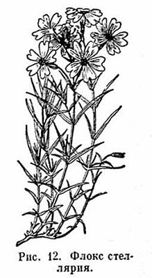Флокс стеллярия (Ph. stellaria Gray), звездчатый (рис. 12). Растет на крутых и обрывистых южных склонах гор, иногда в трещинах скал, от Иллинойса, Кентукки до Теннеси. Цветет в апреле — мае. Внешне похож на предыдущий вид, но стебли неопушенные, листья линейные, у основания умеренно покрыты волосками. Цветки на боковых побегах расположены без определенного порядка, на длинных цветоножках, бледно-голубые и беловатые; края лепестков рассечены на короткие продолговатые доли.