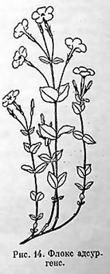 Флокс адсургенс (Ph. adsurgens Torr.), приподнимающийся (рис. 14). Растет в Каскадных горах, в Орегоне. Стебли высотой 20-45 см, лежаче-восходящие, тонкие; растение неопушенное, за исключенном цветоноса и чашечки; листья яйцевидно-ланцетные или яйцевидные, заостренные, в длину до 2,5 см; цветки розовые или беловатые, около 2,5 см в диаметре, собраны в рыхлые щитки; лепестки яйцевидные, цельнокрайние; трубочка почти вдвое длиннее чашечки.