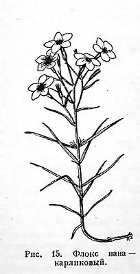 Флокс нана (Ph. nana Nutt.), карликовый (рис 15). Растет в Нью-Мексико, Аризоне, Техасе и Колорадо. Растение высотой от 10 до 30 см, иногда несколько опушенное, разветвленное. Цветущие стебли восходящие, отходят от лежачего деревянистого основания. Листья длиной до 5-7 см и шириной 4-5 мм, линейные, супротивные, иногда очередные. Цветки малочисленные, светло-красные или розовые до белых и желтых, около 2,5 см в диаметре, расположены без всякого порядка, иногда в виде щитка. Лепестки обычно цельнокрайние и закругленные, трубочка несколько длиннее чашечки. Вид очень изменчив. Он имеет несколько разновидностей, например: var. alborosea Brand. — с розово-белыми цветками, цветет в мае; var. lutea Brand. — с желтыми цветками, цветет в сентябре; var. purpurea Brand. — с пурпурными цветками, цветет в сентябре; var. ensifolia Brand. — высотой 6-10 см, с неразветвленным стеблем, цветет в мае; var. triovulata Brand, — высотой 20-30 см с неразветвленным голым стеблем, листьями длиной до 10 см.