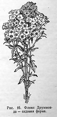 Очень интересен однолетний вид — флокс Друммонда (Ph. Drummondii Hook.) (рис. 16). Растение имеет прямостоячие ветвистые стебли, более или менее покрытые волосками и клейкие, высотой от 15 до 45 см; листья очередные, продолговато-остроконечные или ланцетовидные, из них верхние стеблеобъемлющие; цветки яркие темно- и светло-карминовые, пурпурные, розовые, белые, в широких плотных кистях. Зубцы чашечки длинные и узкие, прямые или отогнутые; лепестки венчика широкие, яйцевидные.