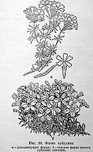 Флокс субулята (Ph. subulata L), шиловидный, называемый на родине моховой гвоздичкой, является типичным представителем группы низкорослых (дерновых) флоксов (рис. 10). В диком виде он произрастает на каменистых и сухих песчаных холмах, часто открытых скалистых склонах и среди голых скал от южной части Онтарио и штата Нью-Йорк до Северной Каролины, Восточного Теннеси и на запад до Мичигана. В Западной Виргинии он поднимается в горы до высоты 1000 м.