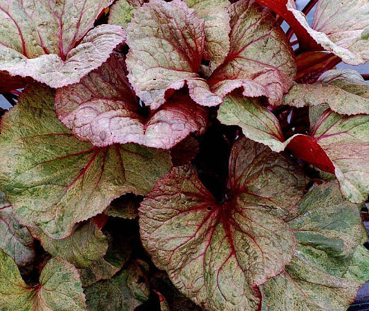 Бузульник зубчатый 'Garden Confetti'. Яркое необычное растение. Весной крупные фактурные листья имеют мраморную окраску — желто-розово-зеленовато-белую. Летом преобладает зеленый цвет. Тыльная сторона листа пурпурная. Цветки характерные для этого вида — желтые "ромашки". Необычный и оригинальный элемент для композиции в тени.
