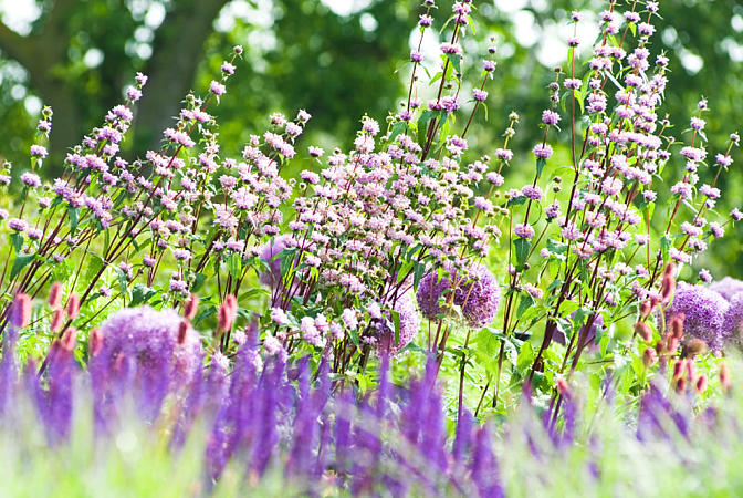 Зопник клубненосный 'Amazone'. Это впечатляющее растение со стеблями высотой до 1,5 м, на концах которых образуются многочисленные крупные соцветия лавандово-розовой окраски. Даже когда цветение заканчивается, стебли все равно выглядят очень эффектно.
