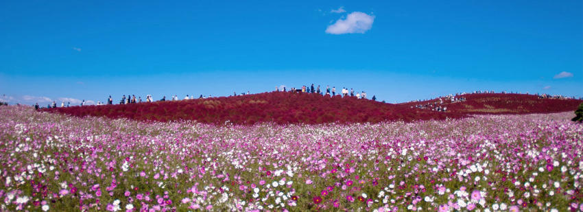 В Хитачи постоянно проводятся цветочные фестивали, для чего на холмах выращивают нарциссы, лилии и другие сезонные цветы. Раз в год, в конце мая, проводится один из самых захватывающих фестивалей — Фестиваль немофилы. 4,5 миллиона голубых цветочков заставляют человека путать небо и землю. Мы тоже насладимся Хитачи в мае, ну, хотя бы с помощью картинок, найденных в интернете:-).