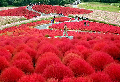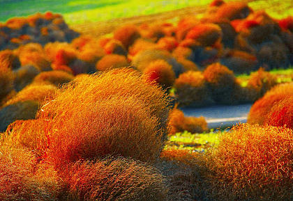 Сейчас осень. В октябре в Хитачи принято любоваться... кохиями. Попробуем и мы. Попробуем взглянуть, не побоюсь этого слова, на торжество кохий глазами японцев. Для нас кохия — что? Несчастное созданье, прозябающее на городской клумбе. Бывает, конечно, они иногда распушатся, как кипарисы. Но это скорее случайность, чаще всего вид у них жалкий (то ли сажают поздно, то ли рассада низкого качества, не поймешь).