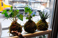 5. Растения. Тут фантазия безгранична. Растений может быть от одного до... сколько влезет в шар кокедамы. Интересны композиции из разных растений. Для кокедамы лучше всего подойдут папоротники и влаголюбивые растения (если используется зеленый мох, который требует влажного грунта и опрыскивания) и теневыносливые (зеленый мох нельзя выставлять на прямое солнце) или даже суккулентные (если зеленый мох не используется).
