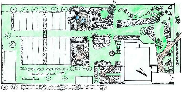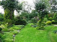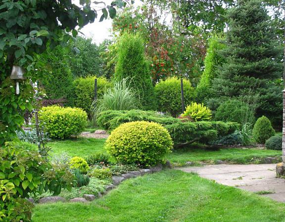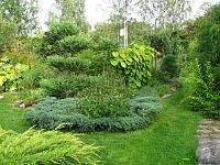 Поперек сад разделен также на две части — декоративную с домом (верхнюю) и хозяйственно-огородную (нижнюю). На центральную дорожку-ось в декоративной части как бы насажены отдельные зоны-кабинеты, отделенные друг от друга ширмообразующими растениями — хвойными и листопадными деревьями и кустарниками. При помощи такой планировки мне удалось решить несколько задач: зоны сада функционально изолированы; каждый кабинет-зону можно спланировать в собственном стиле; искусственно удлинены маршруты прогулок по саду; создан микроклимат для тематических коллекций — сделана защита от ветра и созданы условия для снегозадержания, выделены теневые и солнечные участки. Кроме того, из‑за отсутствия общего обзора сад кажется значительно больше своих истинных размеров. Дополнительно с северо-востока сад закрыт живой изгородью из стриженых елей, туй.