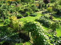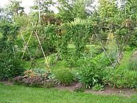 В "промышленной" зоне все грядки расположены поперек склона, и поверхность их повернута к солнцу. Лишняя вода убирается уклоном дорожек. И так же, как в декоративной части, микроклимат создается ширмами из плодовых и декоративных пород — яблони, сливы, грабы, спиреи, барбарисы.