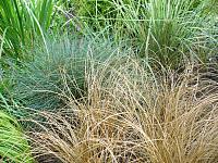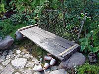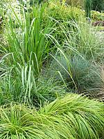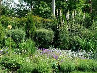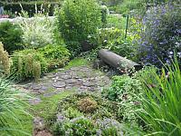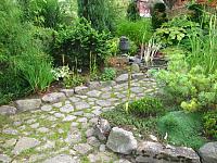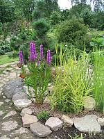 Далее вдоль дорожки газона идет поднятый цветник из альпийских растений, где условия для них создаются геопластикой. За ним расположен полностью скрытый от посторонних взглядов сад злаков с маленькой площадкой для уединенного отдыха.
