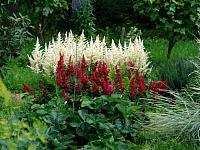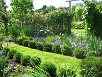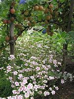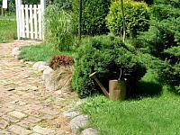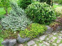 Перед ними в два ряда посажен шпалерный плодовый сад. Все места посадок декоративных культур подняты над уровнем газона на 30-40 см при помощи бордюра из крупных валунов, что дает возможность для каждой группы растений создать нужный режим по влаге и сократить полив.