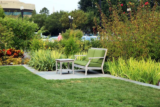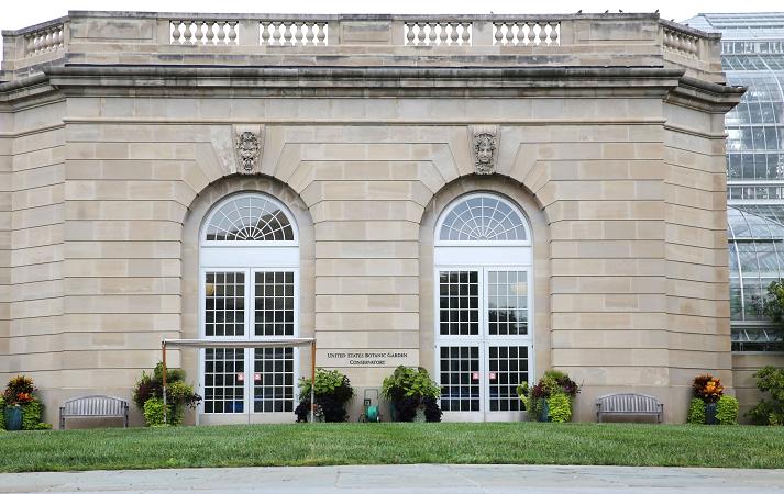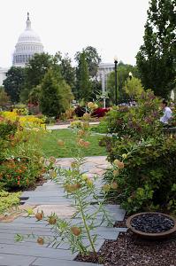 Вид с дальней точки сада. Видна оранжерея (белое здание слева), а за ней белый купол Капитолия.