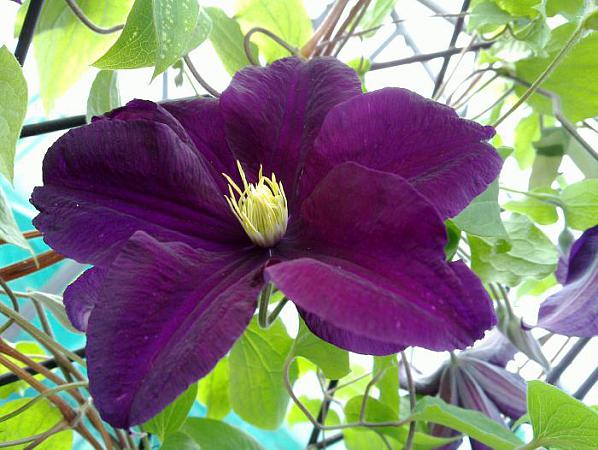 Blekitny Aniol. Длина побегов 3-4 м. Диаметр цветка 7,5-10 см. Чашелистиков 4-6, они небесно–голубые, края гофрированные. Пыльники желтые. Цветение обильное, VII- IX. Группа обрезки 3.