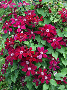 Westerplatte. Длина побегов 2-3 м. Диаметр цветка 10-14 см. Чашелистики бархатистые малиново–красные. Пыльники темно–красные. Цветение VI-IX. Группа обрезки 2.
