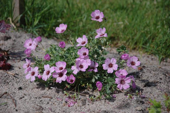 Герань пепельная (G. cinereum) — всеобщая любимица. Кустик крошечный, не ползет и не распадается, цветет с перерывами с июня до заморозков. Все сорта хороши — 'Ballerina', 'Purple Pillow', 'Splendens', 'Carol', 'Sateen', 'Giuseppe' и новенькая 'Rothbury Gem'. Вопрос не в том, заводить или не заводить (заводить обязательно!), а в том, как ее сохранить с момента покупки до начала посадочного сезона. Это одна из немногих гераней, у которых с этим проблемы.