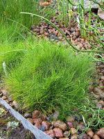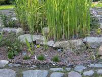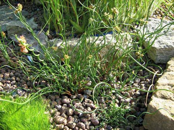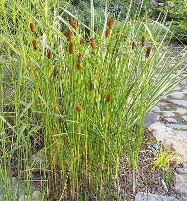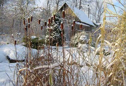 Дальше начинают появляться необыкновенно эффектные ростки камыша (Scirpus lacustris "Albescens" и Scirpus tabernaemontana "Zebrinus"). Потом возникает уже полный фейерверк изящных, золотых, зеленых, полосатых листьев на фоне нежно-зеленого ковра из болотицы (Eleocharis). Зимой над снегом красуются заиндевевшие головки рогоза (Турhа angustifolia).