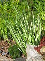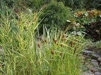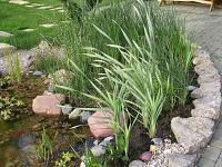 Почему керамзит, а не другая привычная мульча? Как показала практика, керамзит хорошо держит тепло и предохраняет растение летом от пересыхания, зимой от холода. Кроме того, такая конструкция сократила объем полива самого болота и дополнительно осушила как площадку, так и окружающие ее цветники. В таком "болоте" прекрасно себя чувствуют и не расползаются по округе тростник (Phragmites australis "Variegata"), осока (Carex riparia).