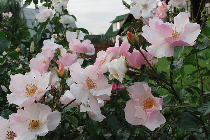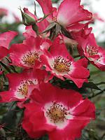 ‘Night Sky’ (Dickson, 2004), F, h=0,7-1,0 Сорт зарегистрирован как флорибунда, но по характеру роста и цветения напоминает скорее шраб. Для флорибунды побеги слишком жесткие и толстые, а цветение выглядит скуповатым, хотя в соцветиях может быть от 5 до 20 цветков. Привлекает пестрая окраска, даже в одном соцветии трудно найти хотя бы два идентичных по окраске цветка. Пожалуй, объединяющим элементом может служить бледно-желтый центр цветка. В каталогах описывают цветки как ярко-красные или тёмно-розовые со сплошными карминно-красными полосками, хотя я воспринимаю их преимущественно в кирпично-красных оттенках. Цветки среднего размера (до 7 см), слегка ароматные, в цветении стойкие.