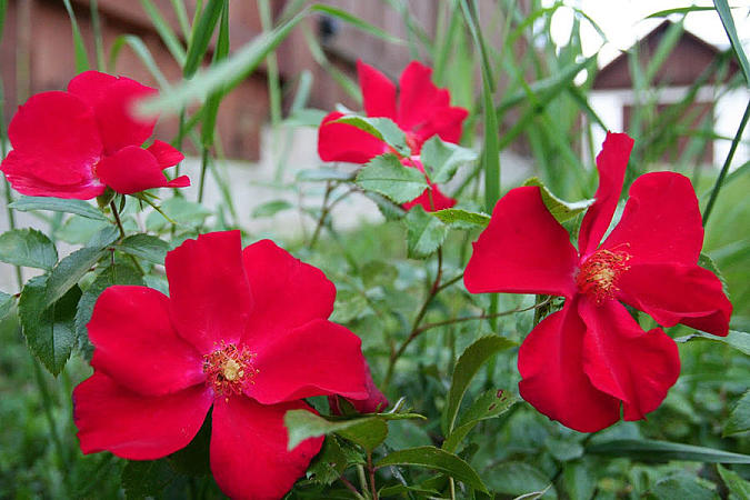 Современная плетистая роза ‘Amadeus’ (W.Kordes’ Söhne, 2003), энергичный и выносливый сорт, много бы потеряла без тычинок. Ее махровый цветок раскрывается в роскошный бант из красного бархата с изящным украшением из золота. Очаровательные цветки повторно цветущей розы Rambler ‘Open Arms’ (Warner, 1995), не портят даже подсохшие пучки тычинок.
