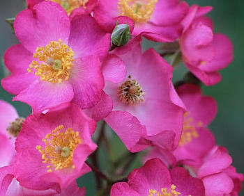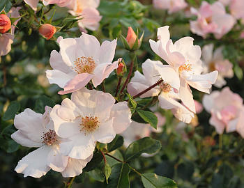 Простые цветки особенно стараются понравиться. Тычинки чаще густые, высокие, иногда «толстенькие» (как у сорта ‘Pimprenelle’ Delbard,1997). Если присмотреться, то можно заметить различные способы их оформления: аккуратные пучки, букетики или венки, изящные ажурные клубки и небрежно рассыпающиеся ряды. Даже пыльники заслуживают внимания, у некоторых сортов они однородные, нарядные и пушистые, а у других имеют забавный вид.