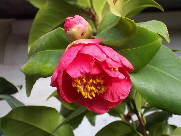 Чтобы не замерзла корневая система, горшки я поместила в большую коробку, выложенную пенопластом, а над растениями повесила балдахин из двойного слоя "Агроспана 19". В таких условиях началось цветение. У сасанквы оно наступило в середине ноября, она всегда расцветает раньше японской. Японская камелия расцвела в последних числах декабря.