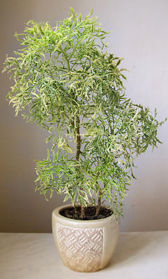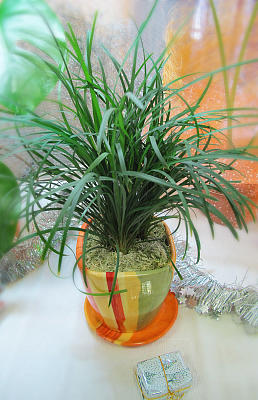 От одного до семи, в зависимости от того, для какого места эта композиция предназначена и какого размера она должна быть. Одиночное растение на отдельном столике, или высокое напольное, украшенное елочными игрушками, превратится в "елку", под которую можно проложить подарки, фрукты, конфеты. Это может быть конечно, и хвойное дерево — туя, можжевельник китайский или кипарисовик, а также мелколистные фикусы или полисциасы. Большой яркий кодиеум почти не нуждается в украшениях, но для такого праздника можно нарядить его в золотистые шарики и бусы.