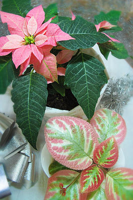 Хороши для таких композиций кодиеумы, ардизии, камелии, фикус каучуконосный 'Melany', хойя карноза, жимолость блестящая, гипоцирта, пеллея, циртомиум и другие папоротники с похожими листьями. Такие растения не потускнеют от соседства с яркими красками и позолотой, а при погашенном верхнем освещении будут отражать огоньки свечей и электрических гирлянд.