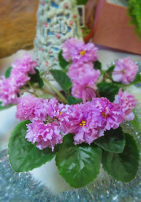 Композиция для украшения праздничного стола должна быть невысокой. Для нее хороши плющи и хойи, из которых можно сделать очаровательные венки, дополненные миниатюрными сенполиями или свечами, золочеными орехами, шишками и конфетами.
