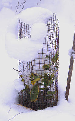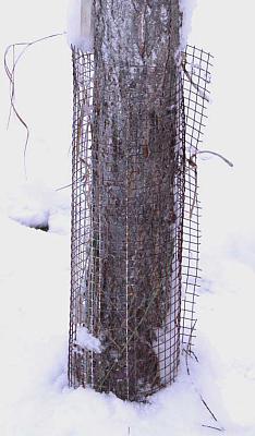 Значит, так. Чтобы не прело в оттепель и задерживало снег в мороз. Чтобы притеняло от солнца весной, но не отучало от света совсем — такая кружевная полутень. Чтобы ветки не разваливались, а ствол дышал...И конечно, чтобы мышь не проскочила. Так вот же оно, решение! Покупаем рулон арматурной сетки. Ячейки и толщина проволоки — на ваш выбор, но помните, что мышь проходит в дырочку меньше 2 см в диаметре. Полевки чуть побольше, но ненамного. Такой сеткой можно не только обернуть стволы и скелетные ветви (и от мышей, и от зайцев), но и стянуть хвойные, рододендроны.