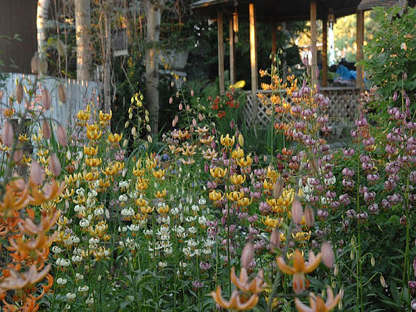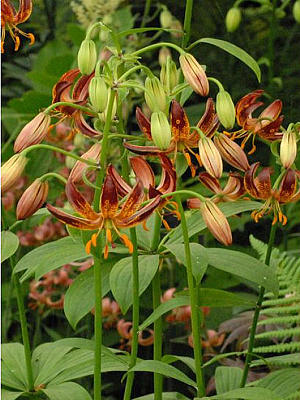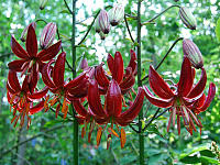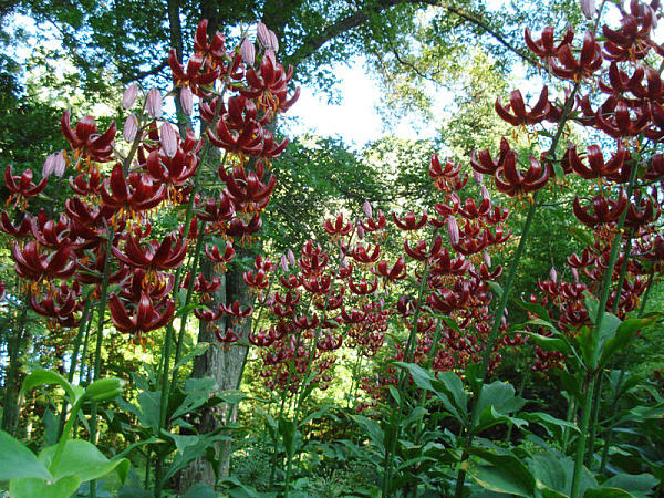 Они не требовательны к почвам и легко справляются с сорняками. Высокорослые (до двух метров), с яркой красивой листвой, расположенной правильными мутовками, с колоссальными соцветиями, на которых одновременно может быть открыто до 50 цветков, мартагоны всегда желанны в саду. Прибавьте к этому, что они не требуют полного солнечного освещения, так как предки их — в большинстве своем лесные виды. Их луковицы живут 50-60 лет и могут без выкопки расти на одном месте много лет.