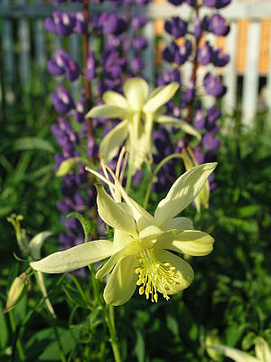 Светлая салатовая или голубая листва аквилегий хорошо контрастирует с темной массой краснолистной цимицифуги; голубые и сиреневые цветки выгодно смотрятся в обществе бледно-лимонных лютиков или желтолистных трав. Интересны сочетания синих аквилегий с лесной геранью и купальницами. А красноцветковые хорошо выглядят с незабудками, ясколкой и примулами.