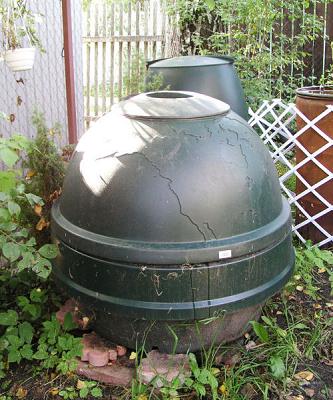 Пластмассовый компостер. Хорошо изолирует отходы с неприятным запахом; вентиляция осуществляется через специальные каналы в дне и крышке