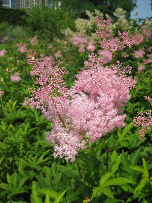 И, наконец, американский лабазник красный (F. rubra). Не путайте его с сортом 'Rubra' лабазника дланевидного, это совершенно разные растения! "Американец" легко достигает двухметровой высоты, за ним можно спрятать забор или отцветающие многолетники. Декоративны не только цветки, но и ярко-красные плоды. Сорта 'Venusta' и 'Magnifica' отличаются оттенком розового цвета, но оба имеют более интенсивную окраску, чем у видовых растений. Есть низкорослая форма, а также форма с белыми цветками.