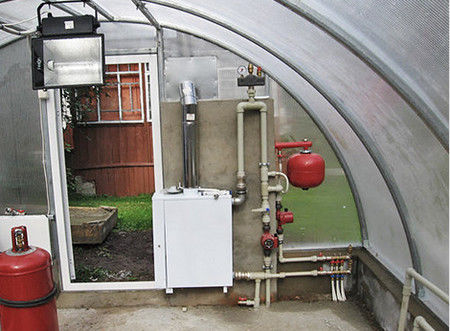 Обогрев теплицы зимой можно организовать также с помощью водяного отопления — одного из самых экономически выгодных, хоть и устаревающих способов. Вода подогревается в бойлере и перекачивается циркуляционным насосом в трубы, которые можно положить вдоль стенок сооружения или между растениями.