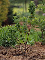 Горные виды волчеягодников выглядят и ведут себя по-другому. Они приземисты, у них темные, глянцевые или немного опушенные листики, цветки в основном собраны на концах приростов.