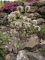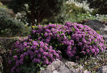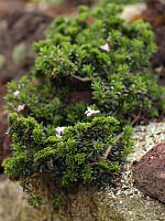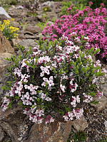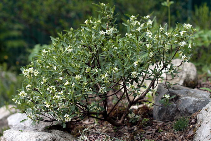 Первая среди них, широко распространенная, давно известная, имеющая множество сортов и гибридов, дафна боровая (D. cneorum). Это растение из разряда "сниженных альпийцев": растет как в нижнем поясе гор, так и в степях и на опушках сухих сосняков. Вечнозеленый полегающий кустарник с ярко-розовыми обильными цветками. Растения сильные, быстро растущие. Взрослый волчеягодник боровой запросто может быть больше метра в диаметре. Наверное, это самая стабильная из горных дафн.