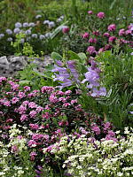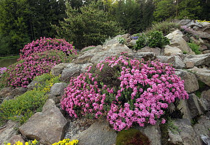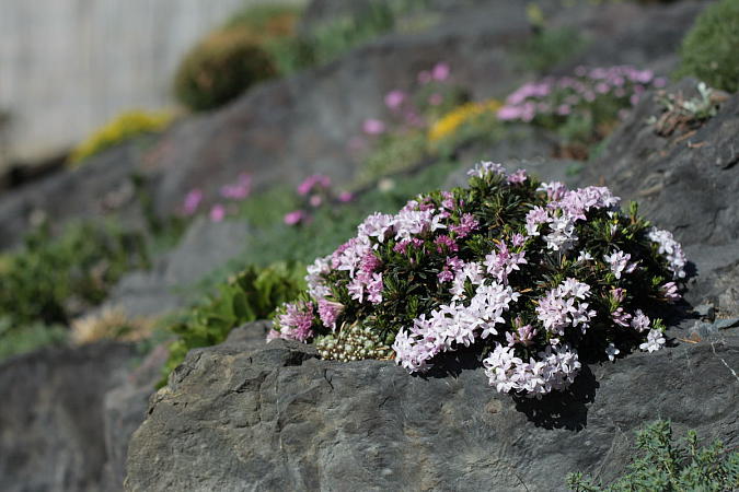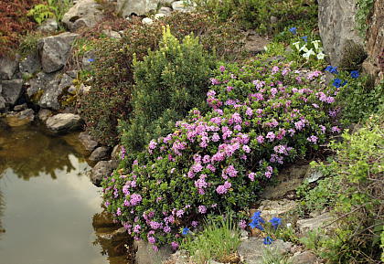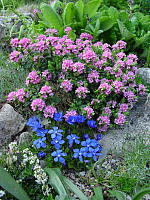 Таким выразительным растениям и свита должна быть под стать. Горным волчеягодникам подходят в соседи миниатюрные альпийские растения. Идеальны в этом плане горечавки: они цветут одновременно и прекрасно контрастируют своей синевой с розовыми оттенками цветков дафн. Сюда можно добавить и другие альпийские растения: прострелы, пенстемоны, левизии и т.д..